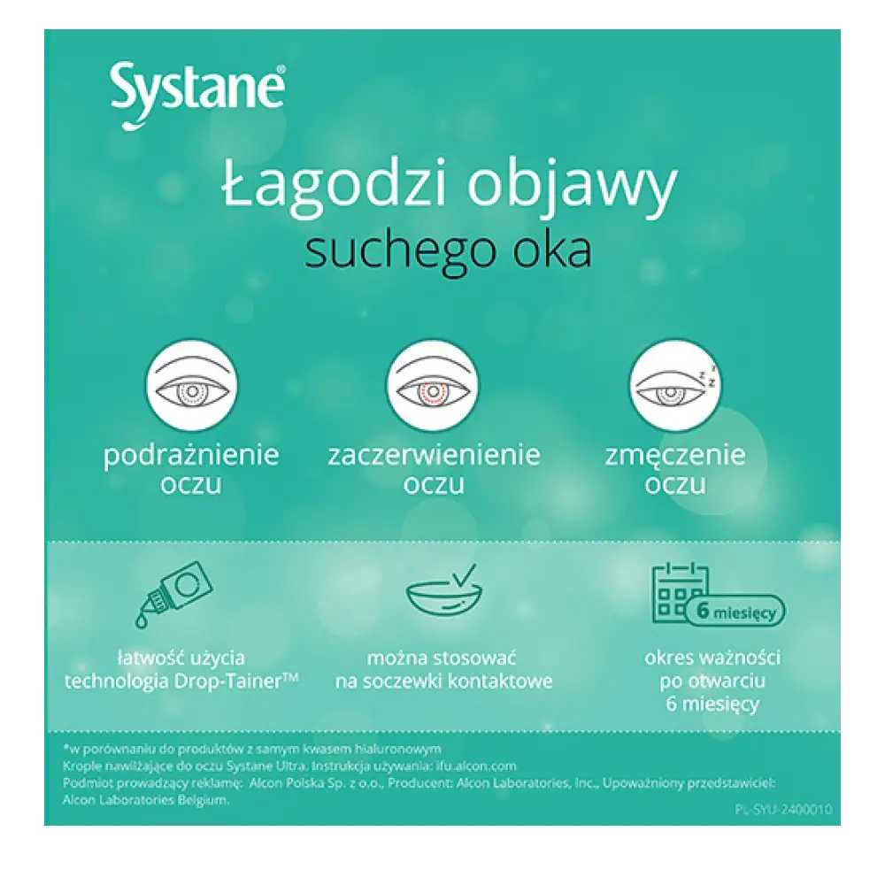 Witamy w świecie ulgi i komfortu dla Twoich oczu!Prezentujemy Systane Ultra, krople nawilżające do oczu stworzone, by przynieść natychmiastową ulgę i długotrwały komfort osobom zmagającym się z uczuciem suchości oczu.